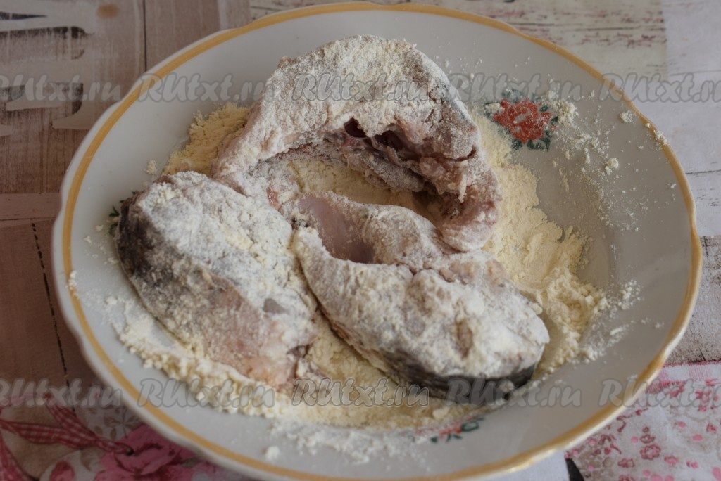 По истечении времени насыпаем в блюдце муку. Обваливаем каждый кусочек рыбы в муке со всех сторон.