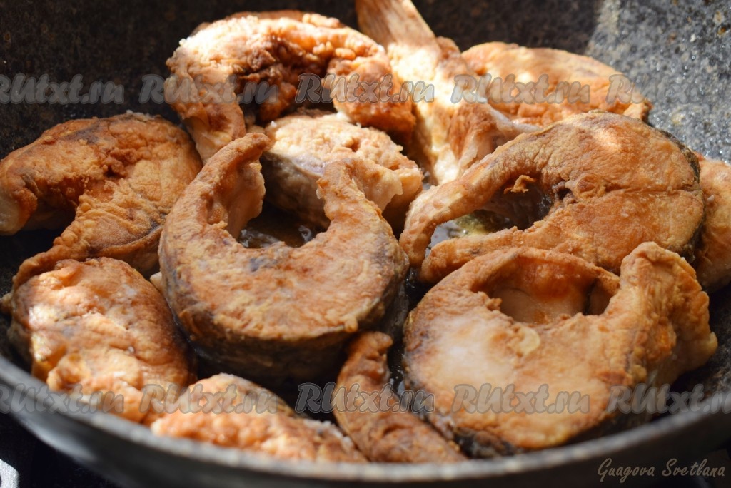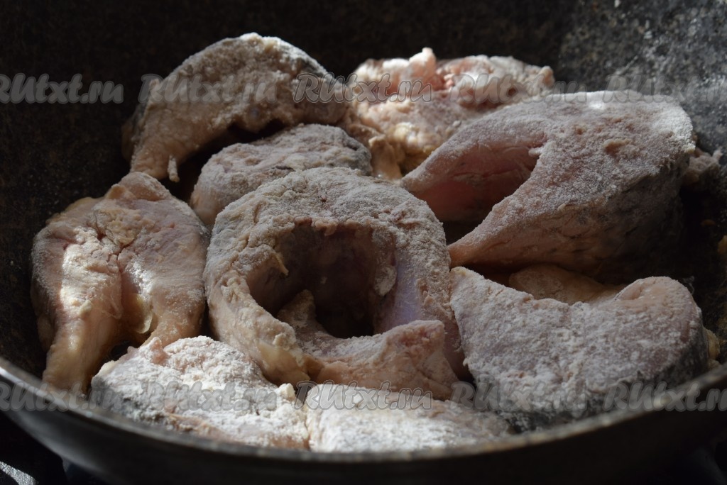 Далее жарим кефаль на среднем огне, периодически переворачивая, до румяной корочки со всех сторон (примерно, 15 минут). Время жарки может меняться, в зависимости от толщины кусочков и размера рыбы.
