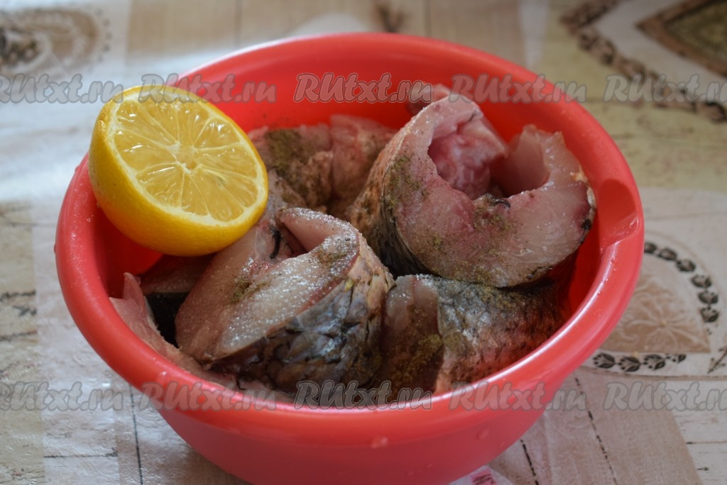 Складываем кусочки кефали в миску, солим и перчим по вкусу, посыпаем любимыми специями (у меня адыгейская приправа). Сбрызгиваем рыбу соком лимона. Оставляем рыбку просолиться и промариноваться в соке лимона и специях, примерно, на 40-50 минут.