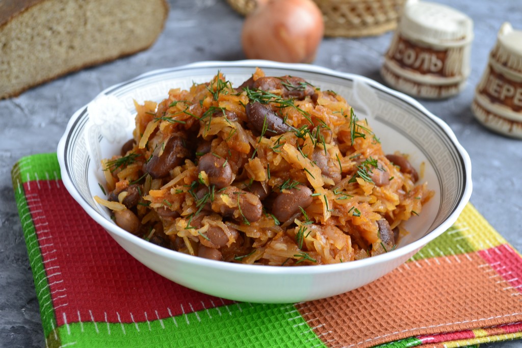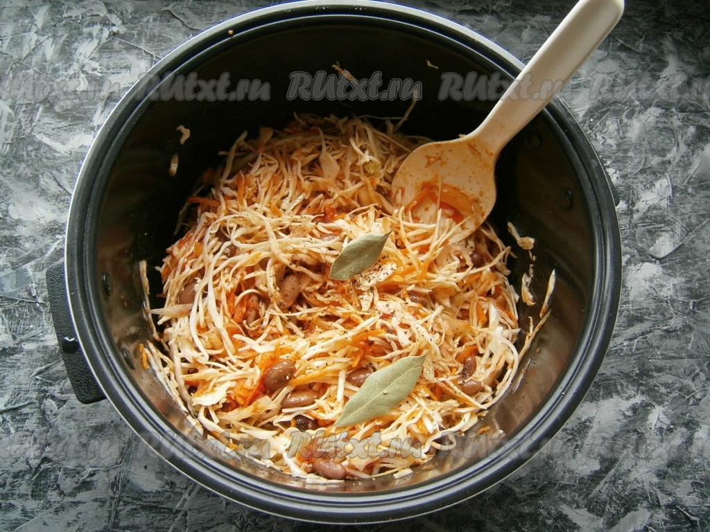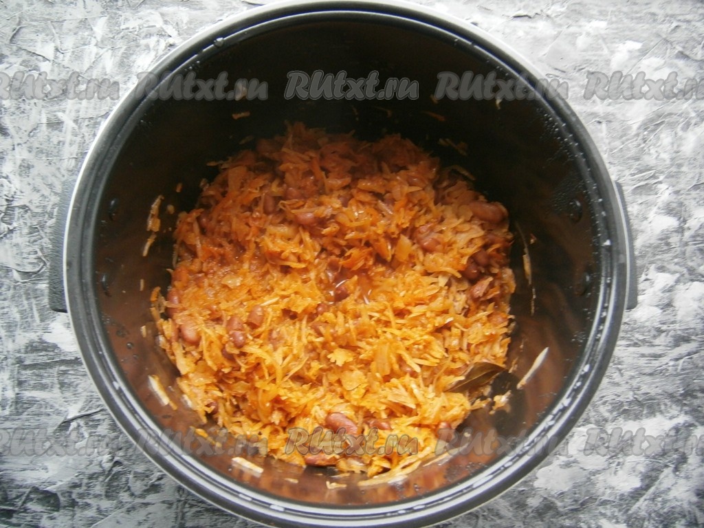 Капуста, тушеная с консервированной фасолью в мультиварке, готова, можно раскладывать по тарелкам. Это сытное, вкусное постное блюдо, наверняка, вам понравится!
