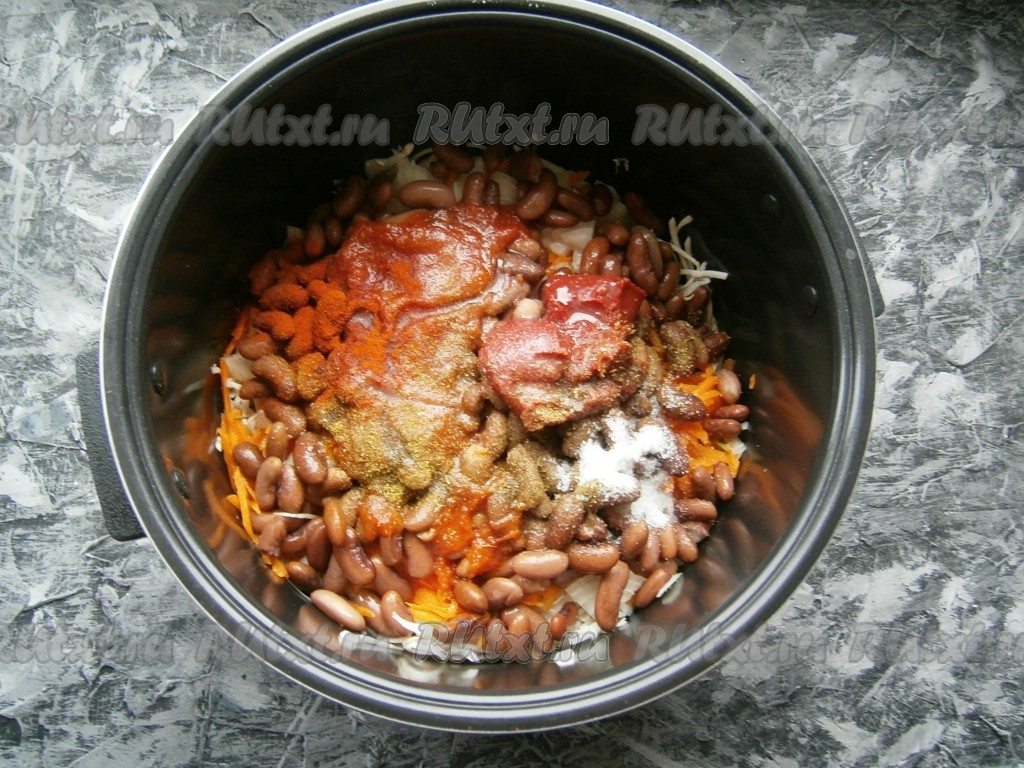 Далее выложить фасоль, добавить томатную пасту и томатный соус, всыпать соль, черный молотый перец, паприку, сахар и хмели-сунели, влить растительное масло.