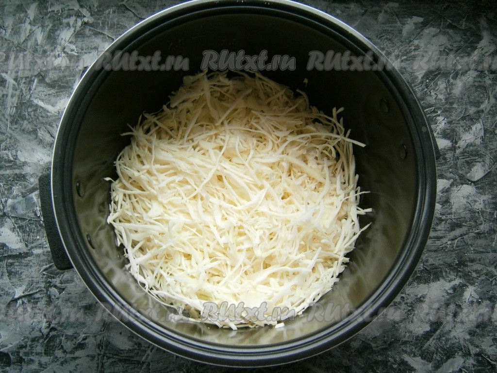 Капусту тонко нашинковать и выложить в чашу мультиварки.