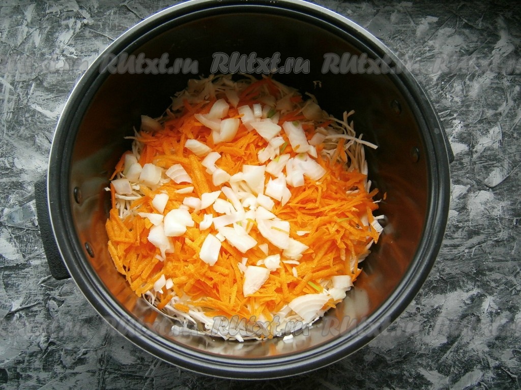 Морковь и лук очистить. В чашу мультиварки поверх капусты выложить натертую на крупной терке морковь и нарезанный произвольно репчатый лук.