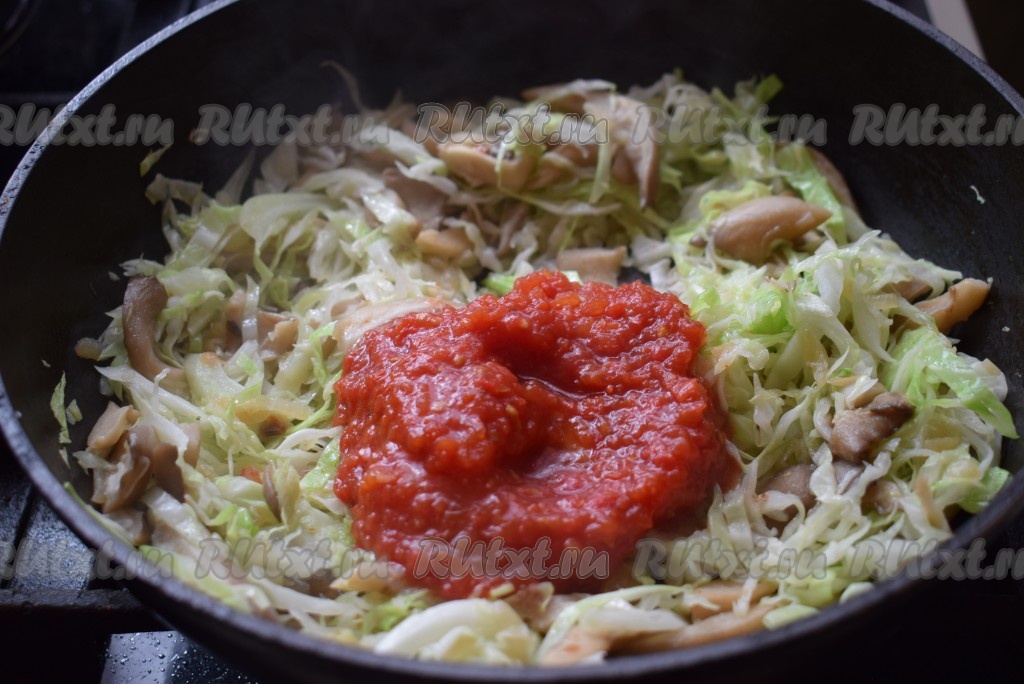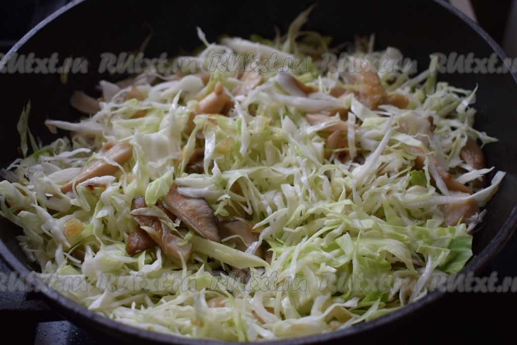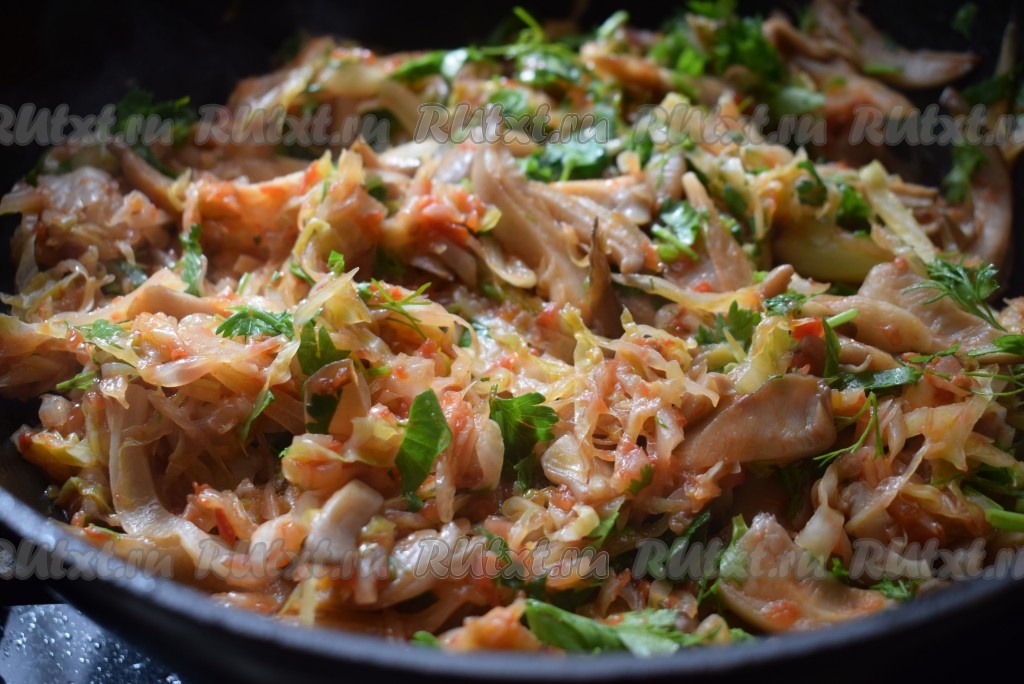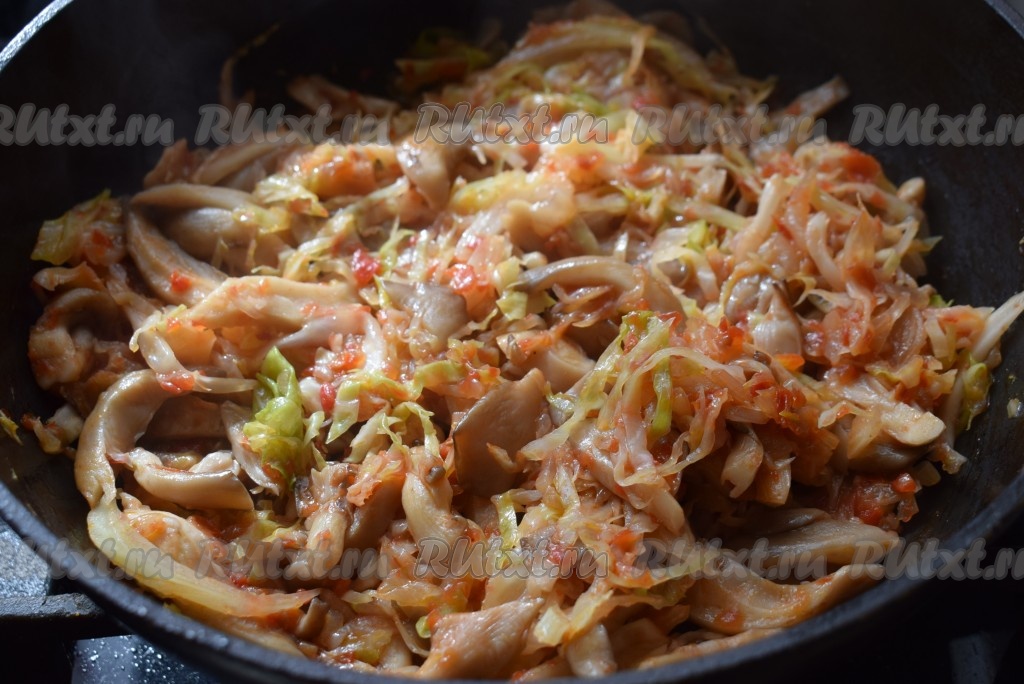 По истечении времени к вешенкам с луком добавляем капусту и тушим минут 15-20 (до готовности капусты), иногда помешивая.