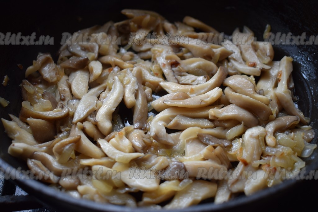 Затем добавляем к луку вешенки, уменьшаем огонь до минимума и обжариваем грибы с луком, периодически помешивая, примерно, 15-20 минут.