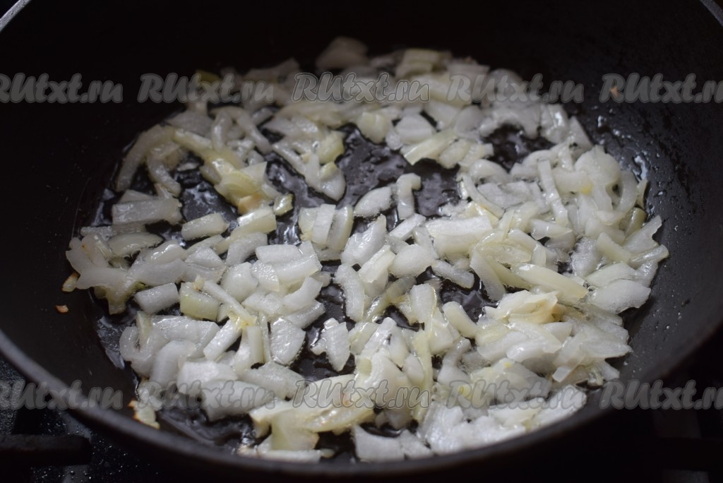 Далее в сковороде разогреем растительное масло, затем выложим лук и обжарим на среднем огне в течение минут 5 (до легкого подрумянивания), иногда помешивая.