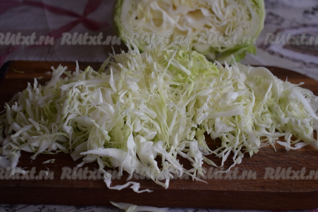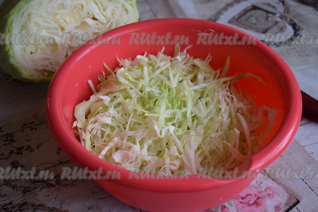 Складываем капусту в миску, слегка присолим, чтобы капуста начала пускать сок (если капуста не молодая, её лучше помять руками). Оставим капусту на 15-20 минут в покое.