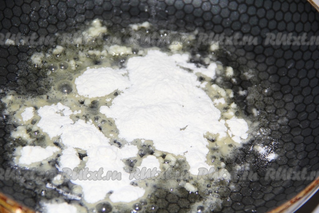Затем добавить муку и обжарить, помешивая. Мука впитает всё масло и приобретёт карамельный цвет.