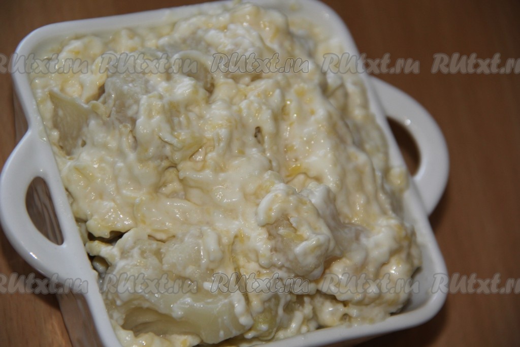 Затем снять сырный соус с огня и выложить в него цветную капусту, разобранную на соцветия. Я готовила с замороженной цветной капустой и предварительно её не размораживала (если готовите со свежей цветной капустой - её не нужно предварительно отваривать). Перемешать капусту с соусом и выложить в жаропрочную форму. Я дно и бока формы предварительно смазала сливочным маслом.
