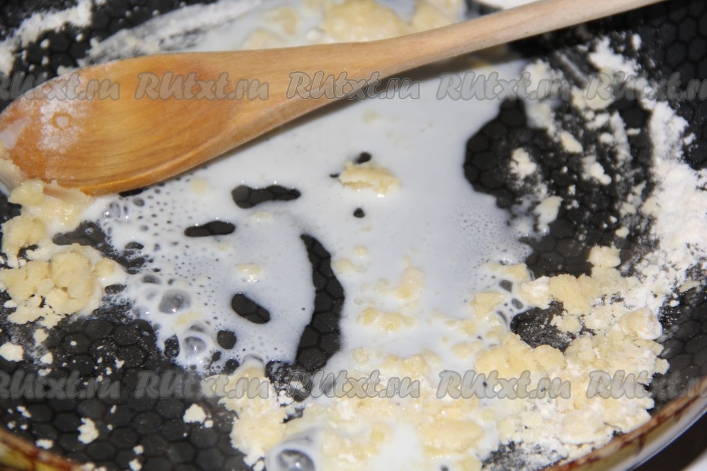 В мучную смесь постепенно влить молоко, непрерывно перемешивая.