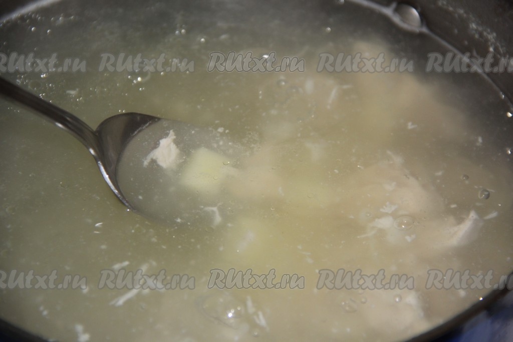 Для приготовления этого супа куриную грудку можно сначала нарезать на части, а затем сварить из неё бульон. Я же решила целую грудку залить 2,5 литрами воды и отварить до готовности в течение минут 30. Затем я достала мясо из бульона, нарезала на небольшие кусочки и вернула в бульон.