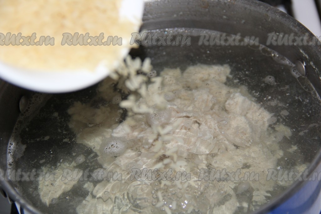 В кипящий куриный бульон выложить картофель и всыпать рис, довести до кипения и уменьшить огонь. Я использовала пропаренный рис, поэтому его не промывала (если используете не шлифованный рис, то сначала промойте его).