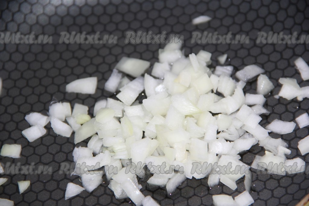 В сковороду влить растительное масло и выложить мелко нарезанный лук, обжарить на среднем огне, иногда помешивая, до золотистого цвета.