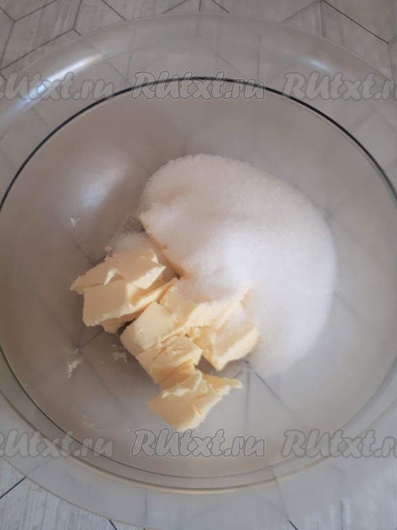 Продукты для приготовления кекса должны быть комнатной температуры. Если творог неоднородный (крупинками), его нужно протереть через сито или пропустить через мясорубку. Выложить изюм в небольшую ёмкость, залить полностью кипятком, оставить минут на 5, после этого воду слить, обсушить изюм, разложив его на бумажном полотенце. Сливочное масло комнатной температуры выложить в объёмную миску, всыпать сахар, растереть вилкой до однородности.
