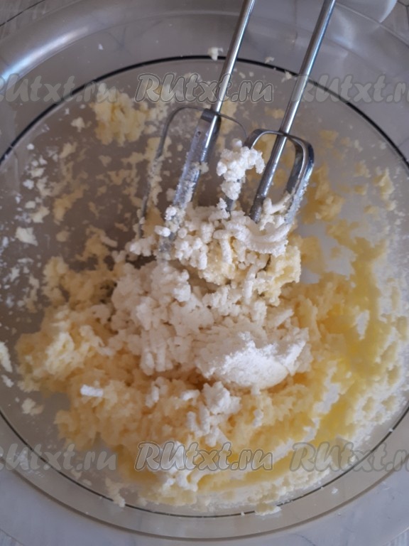 В получившуюся массу добавить половину творога, взбить миксером до однородности.