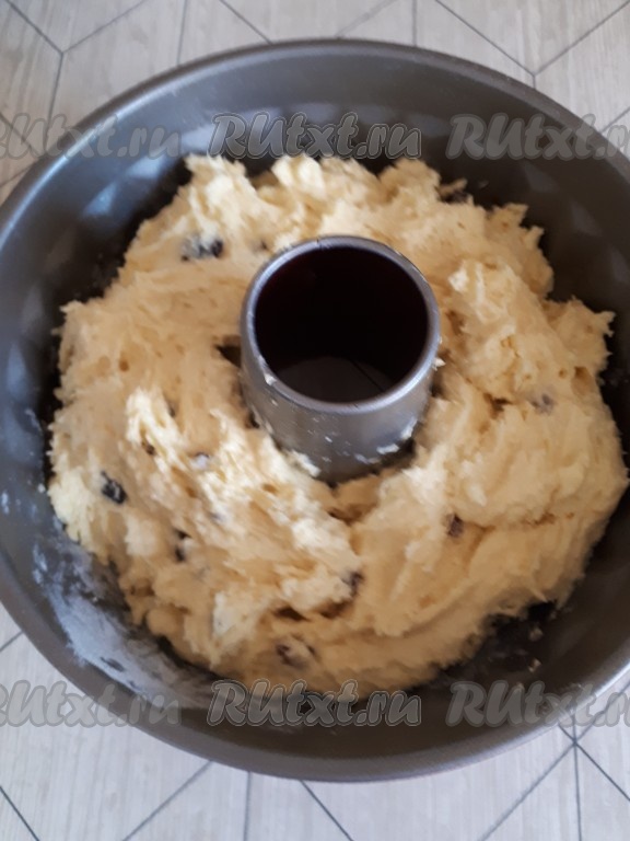 Форму для кекса с дыркой смазать растительным маслом, припорошить мукой. Выложить тесто в форму.