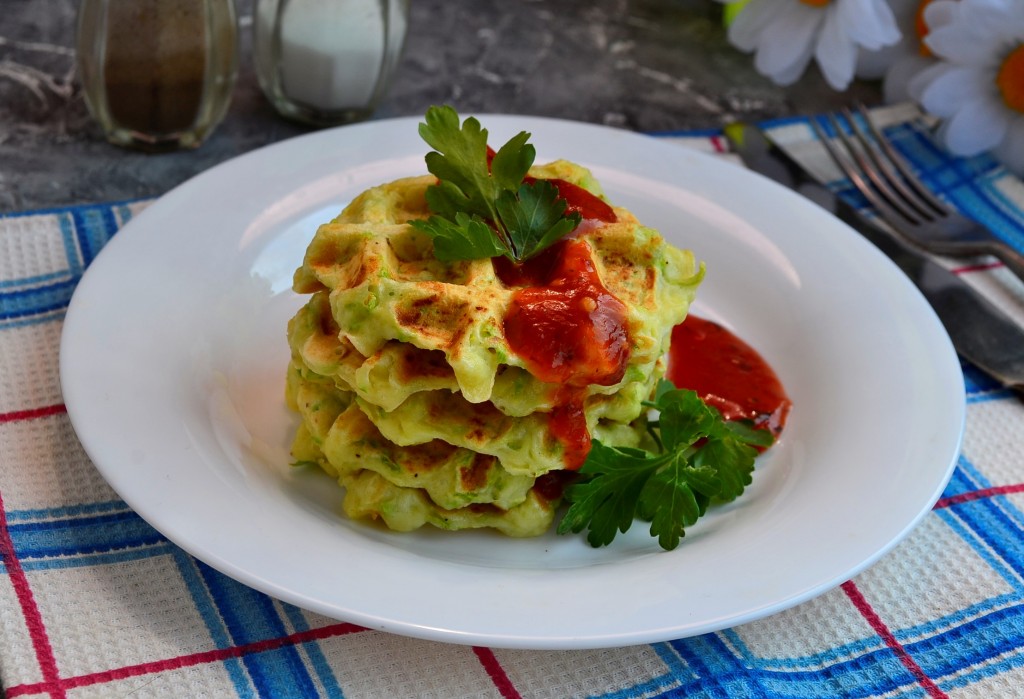 Подавать вкусные и полезные вафли из кабачков, приготовленные в электровафельнице, горячими, дополнив сметаной, томатным соусом или кетчупом.