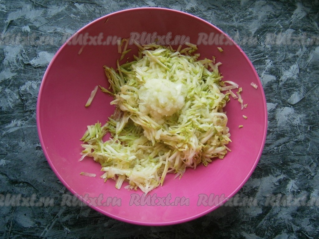 Натереть кабачок на крупной терке (молодой кабачок можно натирать, не очищая от кожуры), очищенную луковицу тоже натереть на терке.