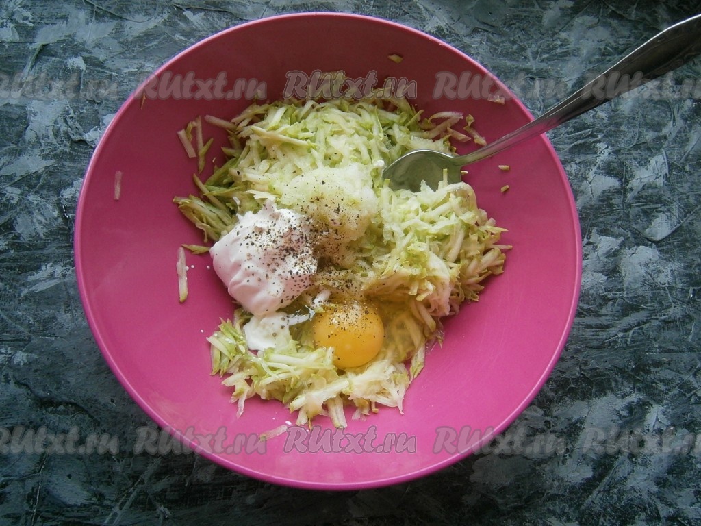 Добавить сметану, яйцо, соль и чёрный молотый перец.