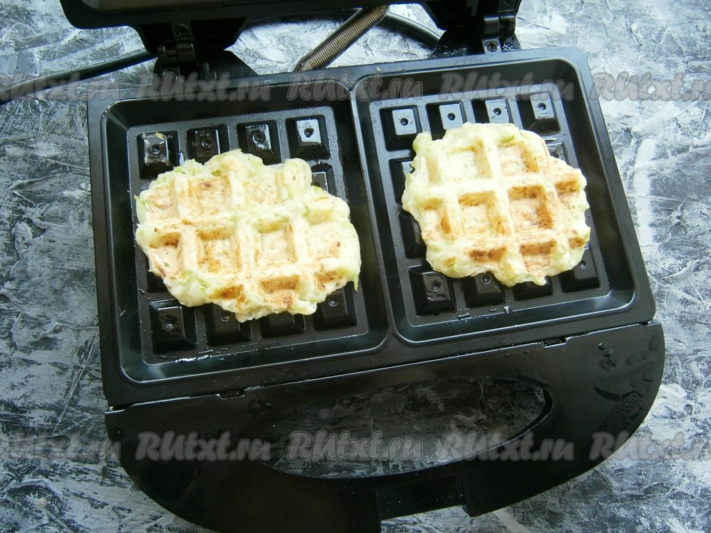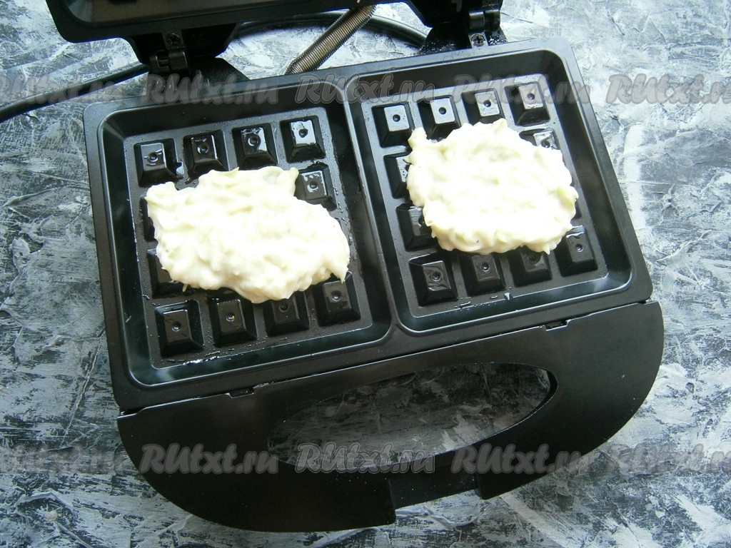 Закрыть вафельницу и выпекать вафли из кабачков около 4-5 минут.