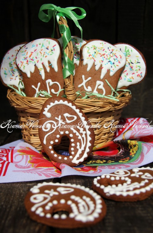 Выпекать пасхальное медовое печенье в духовке, разогретой до 180 градусов, минут 15 (до лёгкого золотистого цвета). Для приготовления глазури миксером взбить охлаждённый яичный белок в пышную пену, затем, не переставая взбивать, понемногу всыпать сахарную пудру и взбивать на средней скорости до тягучего состояния (я взбивала минут 10).