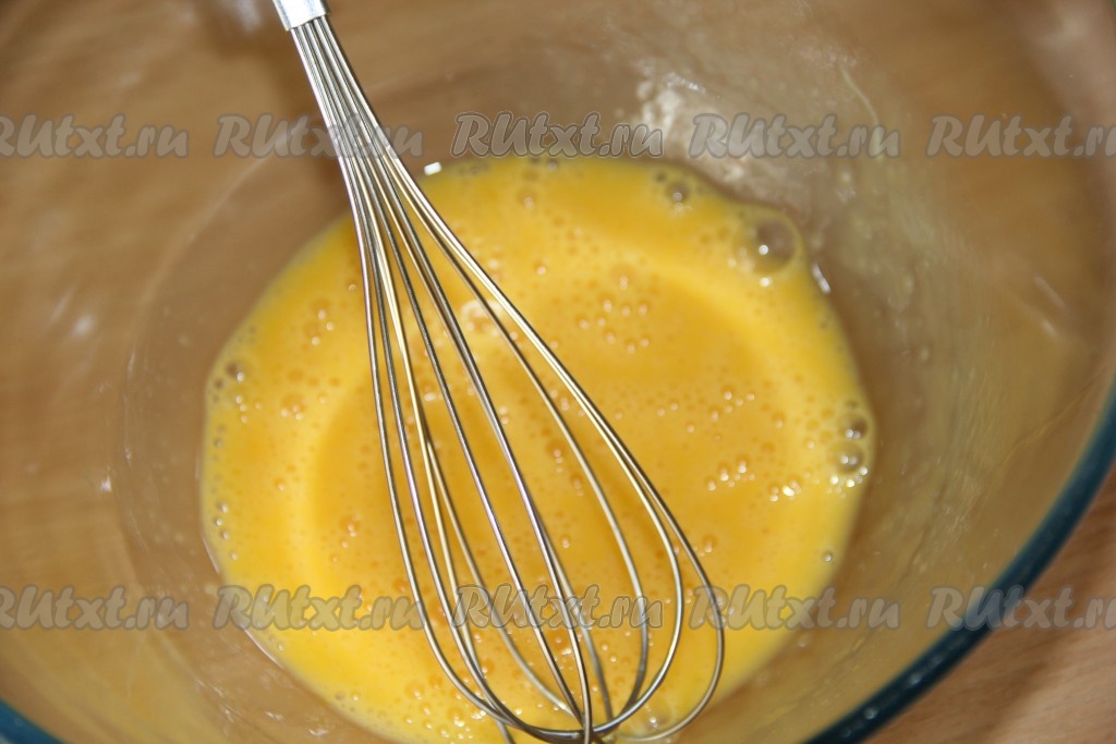 В глубокую миску вбить яйца и взбить венчиком до однородности.