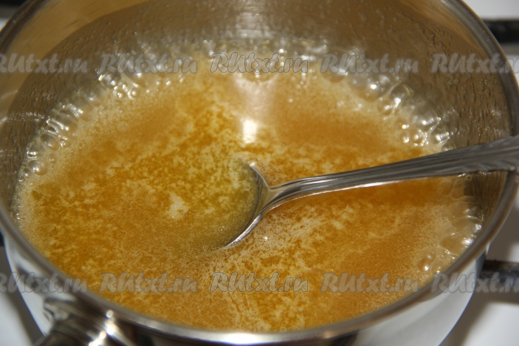 Содержимое кастрюли прогреть на среднем огне, помешивая, до полного растворения масла и сахара.