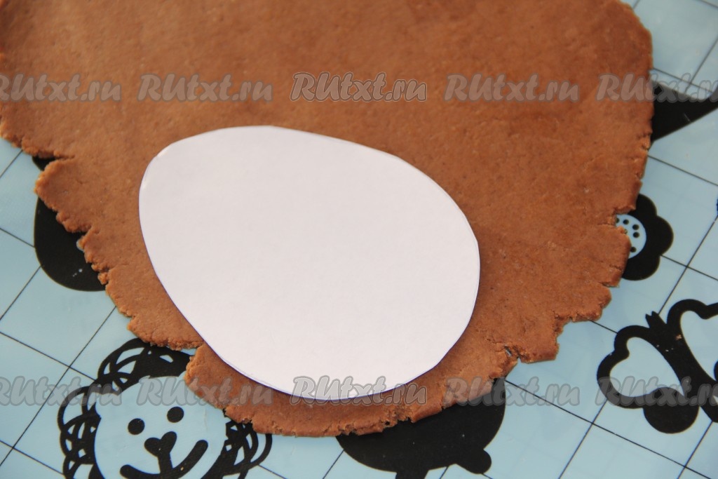 По истечении времени тесто раскатать в пласт толщиной, примерно, 0,5 мм и вырезать печенье любой формы. У меня шаблон яйца и кулича.