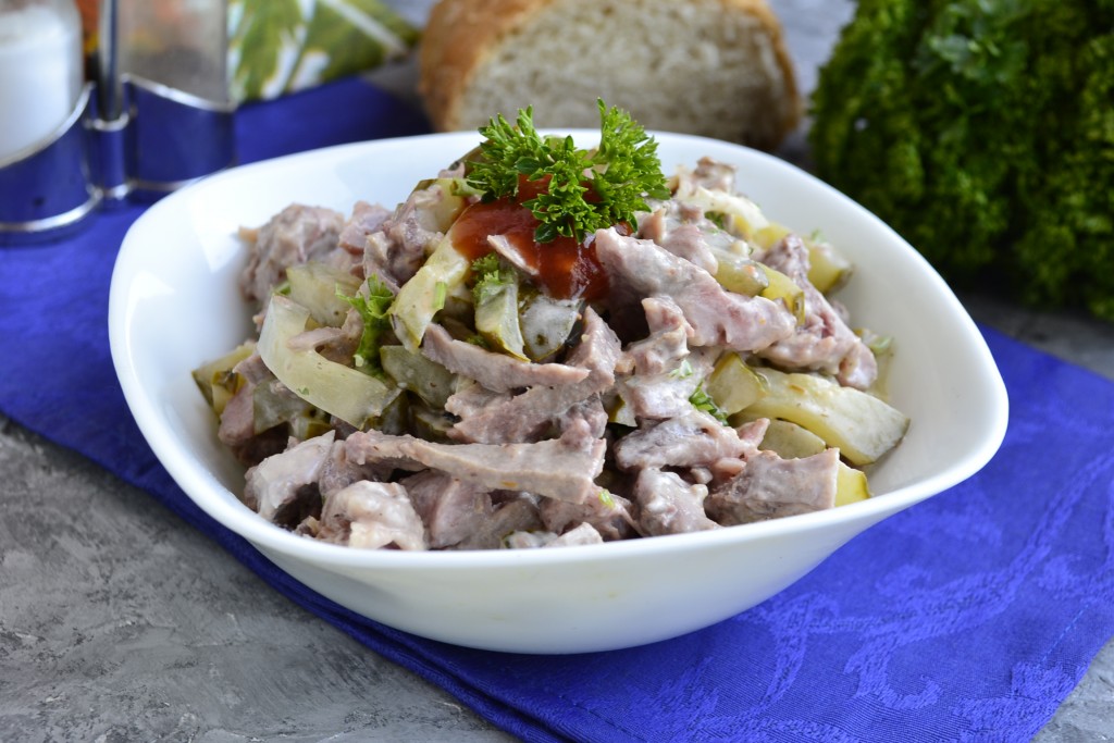 У многих хозяек есть свой рецепт салата с языком. Я хочу предложить вам салат, приготовленный с языком и маринованными огурцами, который нравится моей семье и друзьям. Такой салатик можно подать на любой праздничный стол или к ужину. Язык я использовала свиной, можно, конечно, взять и говяжий. Попробуйте, салат получается очень вкусным!