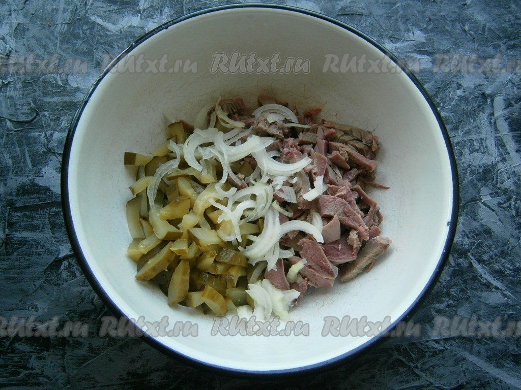 К нарезанному языку добавить очищенный лук, нарезанный тоненькими полуколечками, и маринованные огурцы, нарезанные соломкой (или тонкими брусочками).