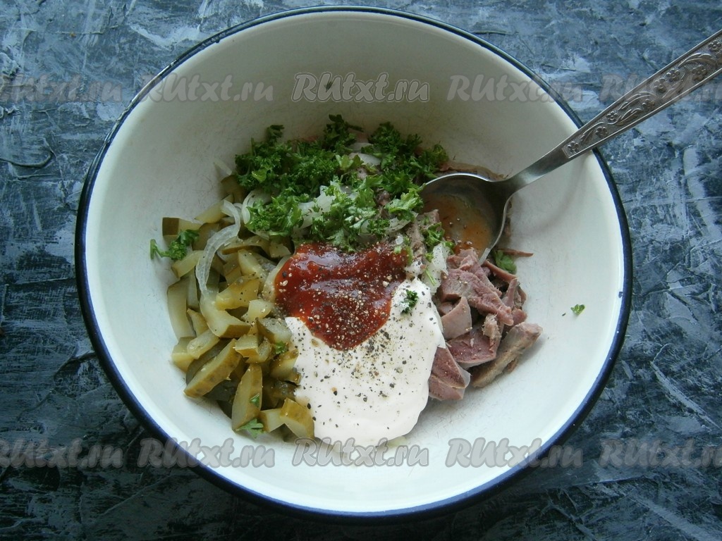 Далее в салат из языка, лука и маринованных огурцов добавить измельченную петрушку, майонез, томатный соус (или кетчуп), посолить и поперчить.