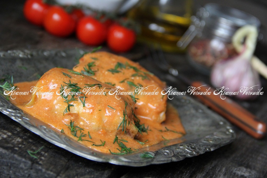 Далее добавить в сковороду сметану, соль и специи, слегка перемешать. Потомить голубцы в томатно-сметанном соусе пару минут, как только соус закипит, снять сковороду с огня.