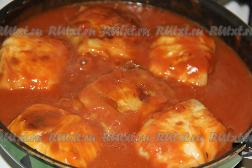 Влить соус в сковороду с голубцами, довести до кипения, уменьшить огонь и томить 15 минут.