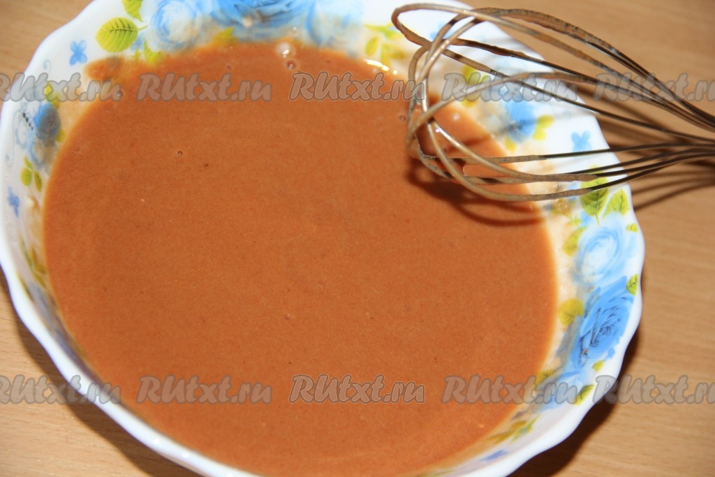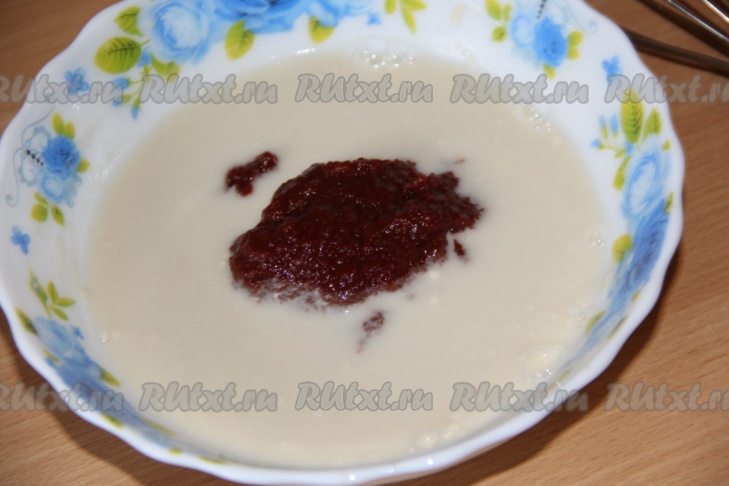 Для приготовления томатно-сметанного соуса в глубокую тарелку влить 200 мл холодной воды, добавить муку и перемешать венчиком до однородного состояния.