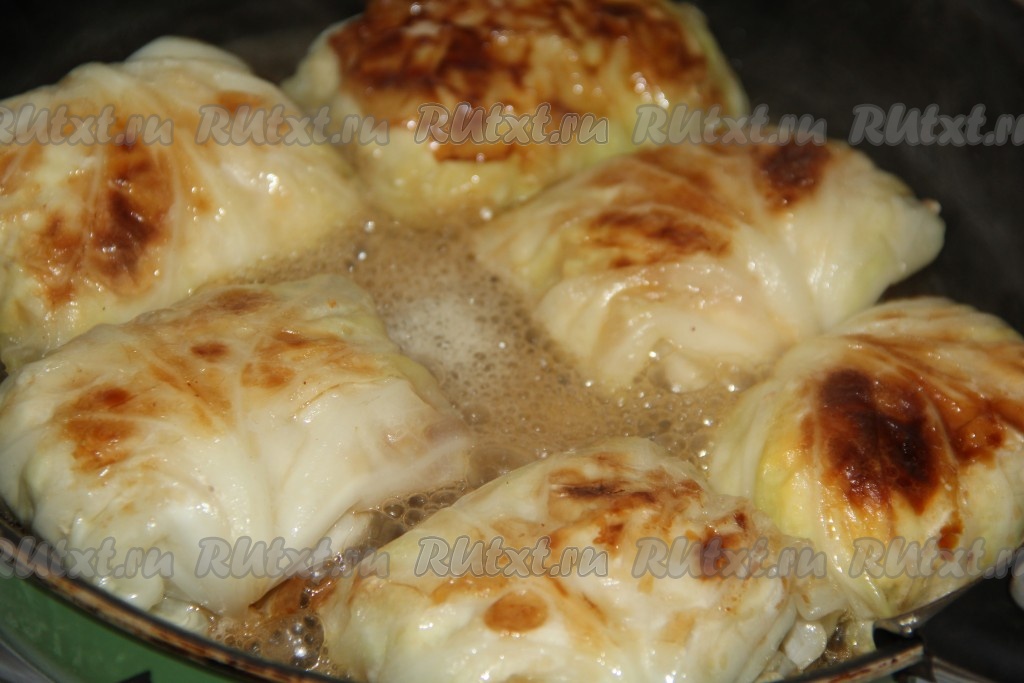 Затем влить в сковороду 100 мл горячей воды, накрыть сковороду крышкой и тушить голубцы 15 минут на небольшом огне.