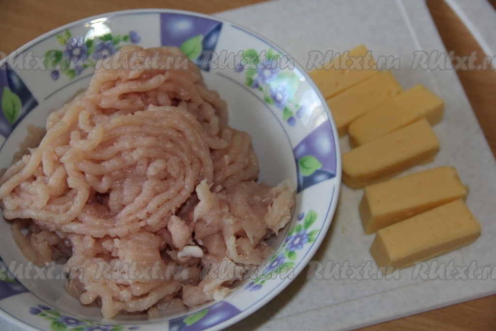 Сыр нарезать на брусочки. Мясо (я взяла куриную грудку) пропустить через мясорубку.