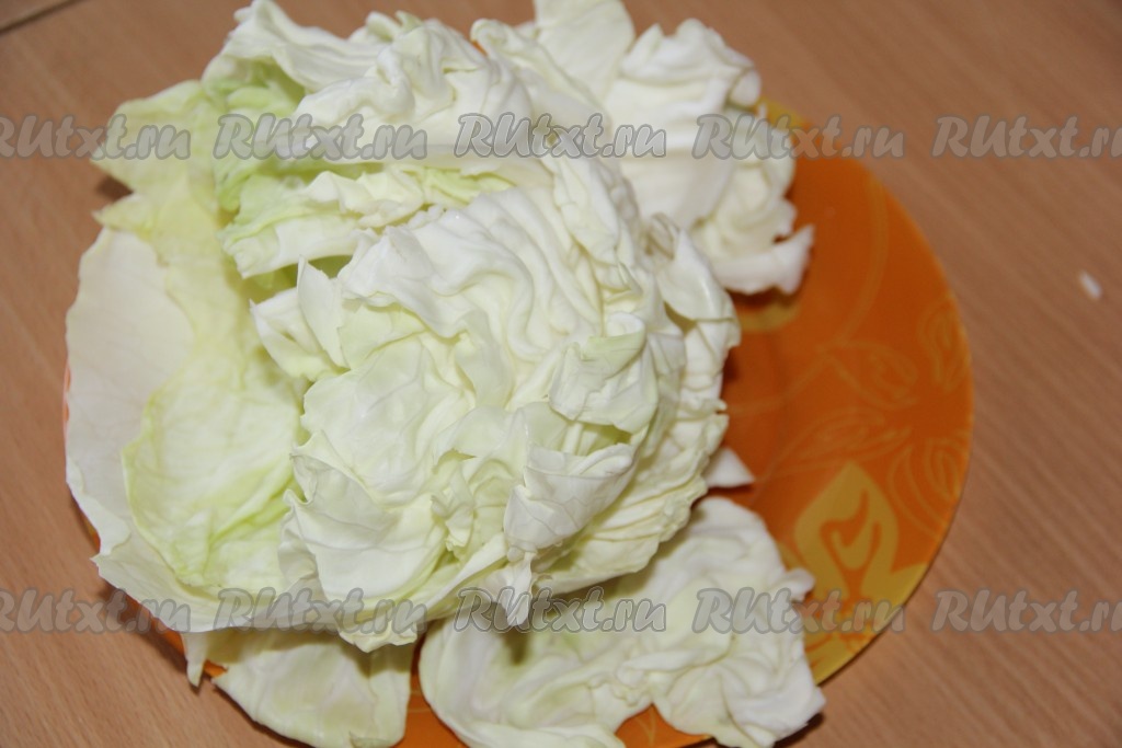 Я сняла листья с кочана капусты и приготовила их в микроволновке. Для того чтобы приготовить листья капусты в микроволновке, их нужно выложить на тарелку и поставить на 10 минут в микроволновую печь при максимальной мощности. За это время листы обмякнут.
