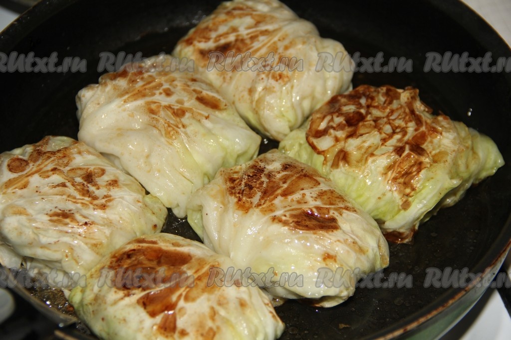 В сковороду добавить немного растительного масла и поставить на огонь. Выложить голубцы в сковороду и обжарить на сильном огне с двух сторон до золотистого цвета.
