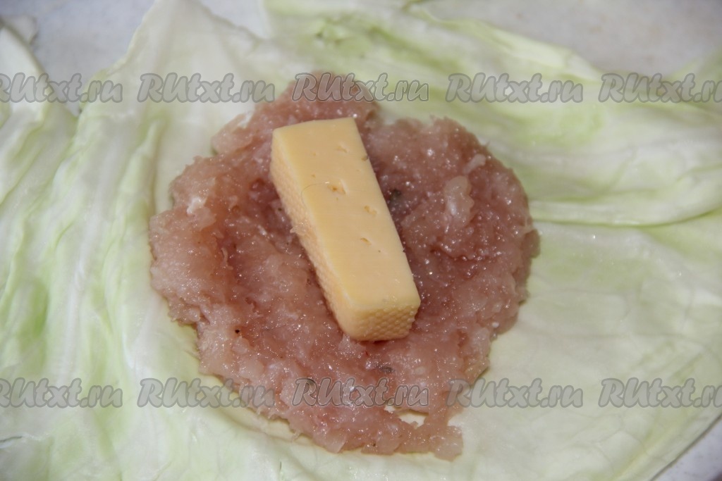 На край капустного листа выложить часть фарша в виде лепёшки, на середину лепёшки выложить брусочек сыра (можно приготовить голубцы и без добавления сыра).
