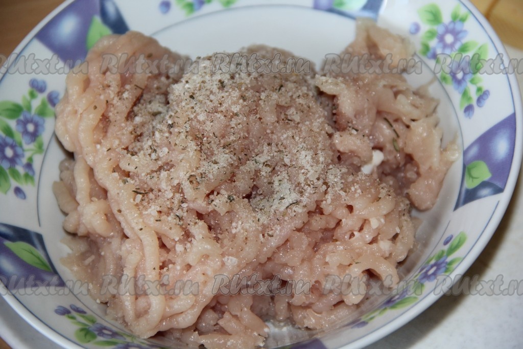 Фарш посолить, добавить специи по вкусу, перемешать.
