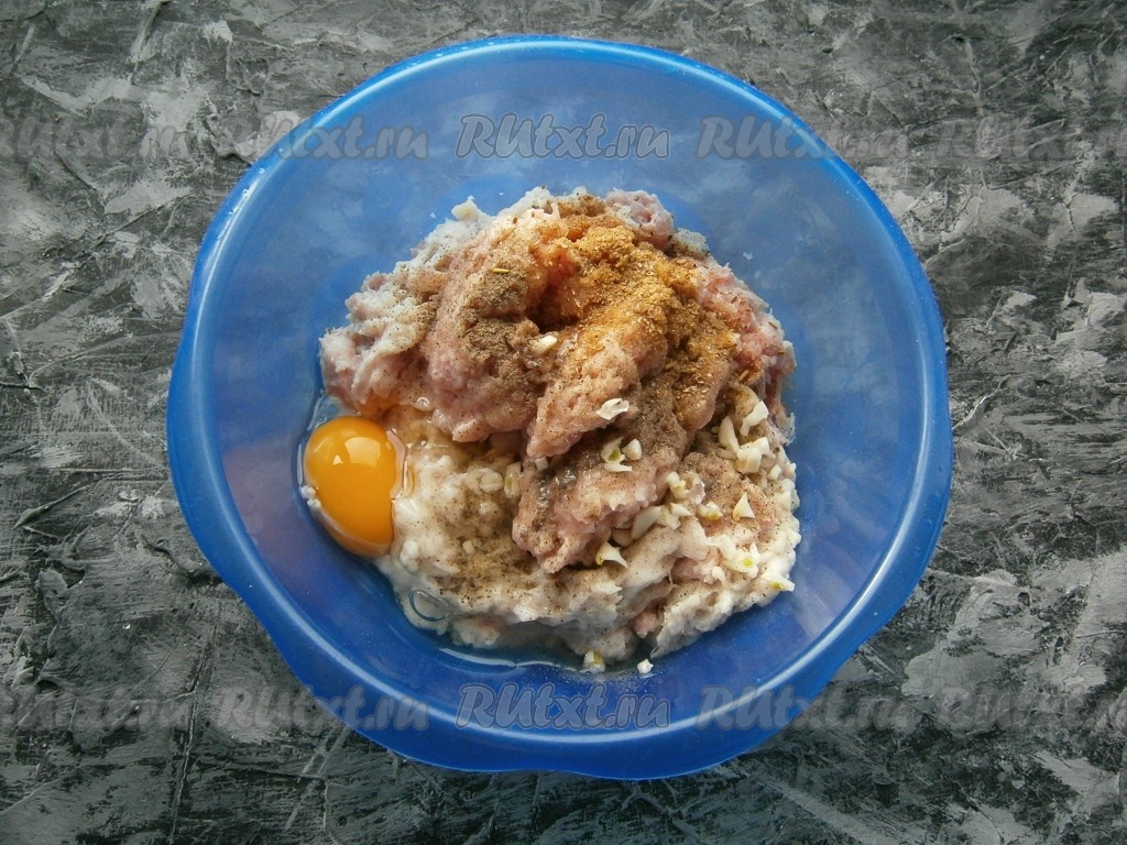 Перекрутить кусочки мяса вместе с очищенным луком на мясорубке (или измельчить в чаше блендера). Выложить получившийся фарш в миску, добавить сырое яйцо, измельченный чеснок, соль, а также специи и чёрный молотый перец, тщательно перемешать получившийся фарш, а затем хорошо отбить о дно миски.
