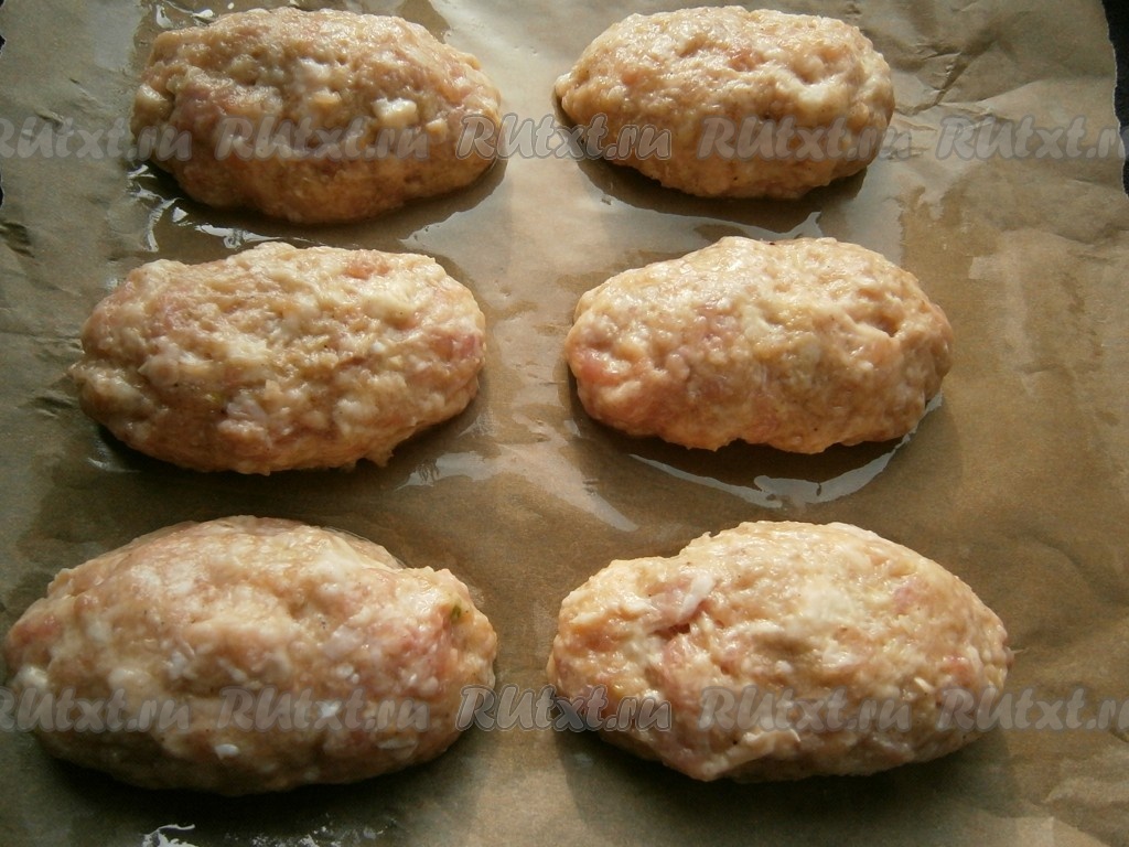 Края мясной лепешки защипнуть так, чтобы сыр оказался внутри, и сформировать продолговатую котлету. Таким же образом сформировать все мясные зразы с сыром. Противень застелить пергаментом, смазать пергамент растительным маслом, а затем выложить зразы.
