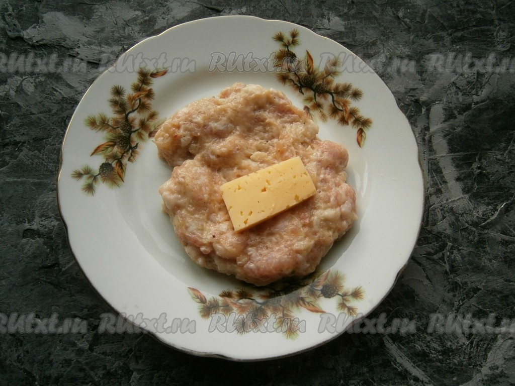 Для формирования зраз, из части получившегося мясного фарша сделать лепешку, в середину которой поместить кусочек сыра (как на фото).