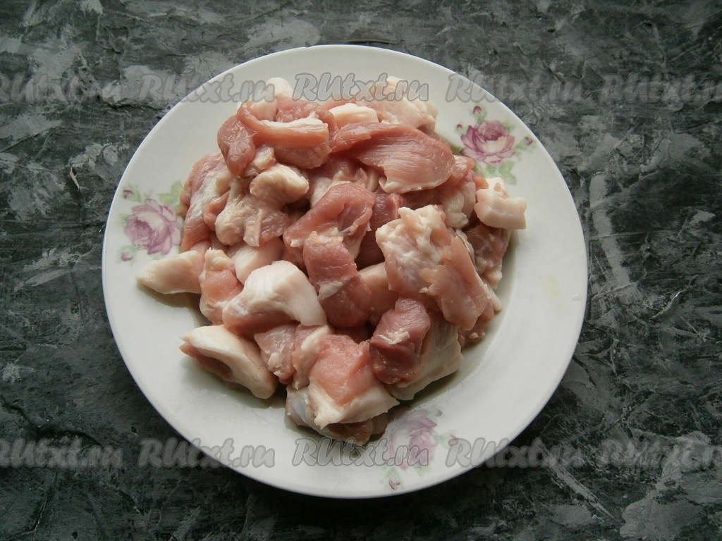 Я фарш для зраз сделала из двух видов мяса (100 грамм куриного мяса и 400 грамм свинины), но подойдет любое мясо, которое вы предпочитаете для приготовления котлет. Мясо нарезать небольшими кусочками.