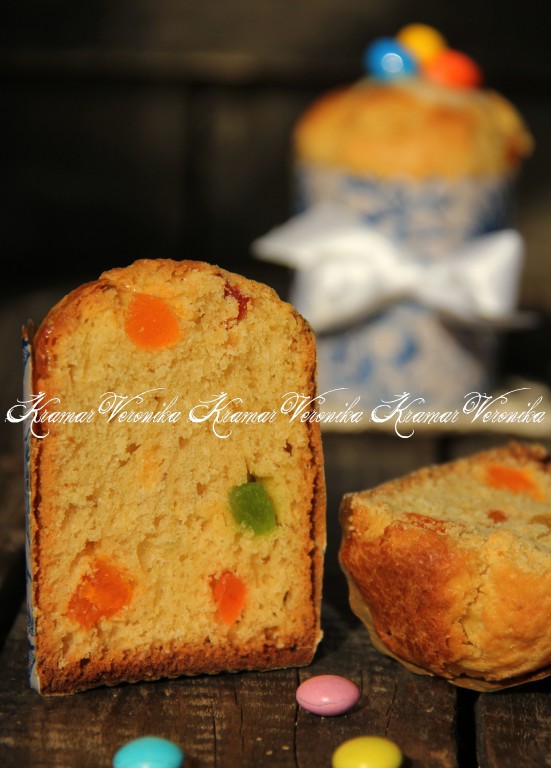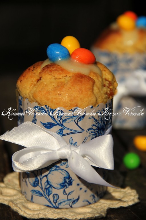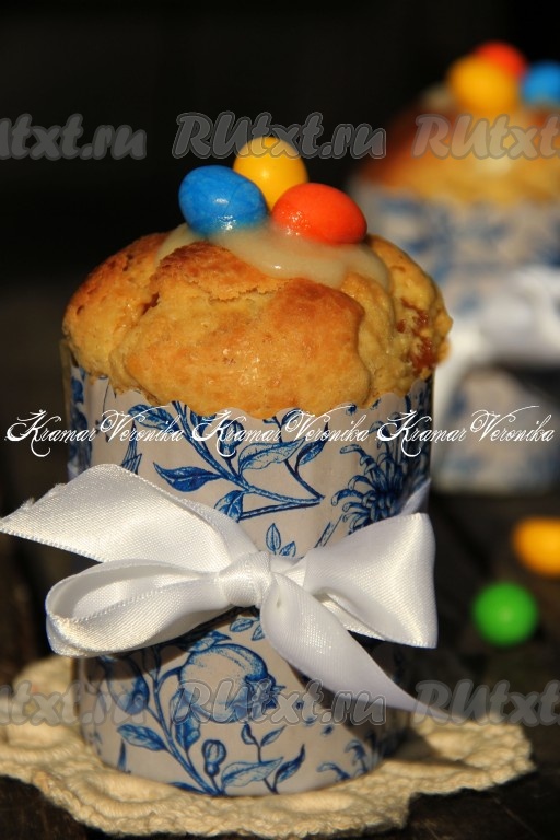 Если честно, мне не захотелось закрывать глазурью эти пышные формы кулича, поэтому я украсила выпечку цветными камушками.