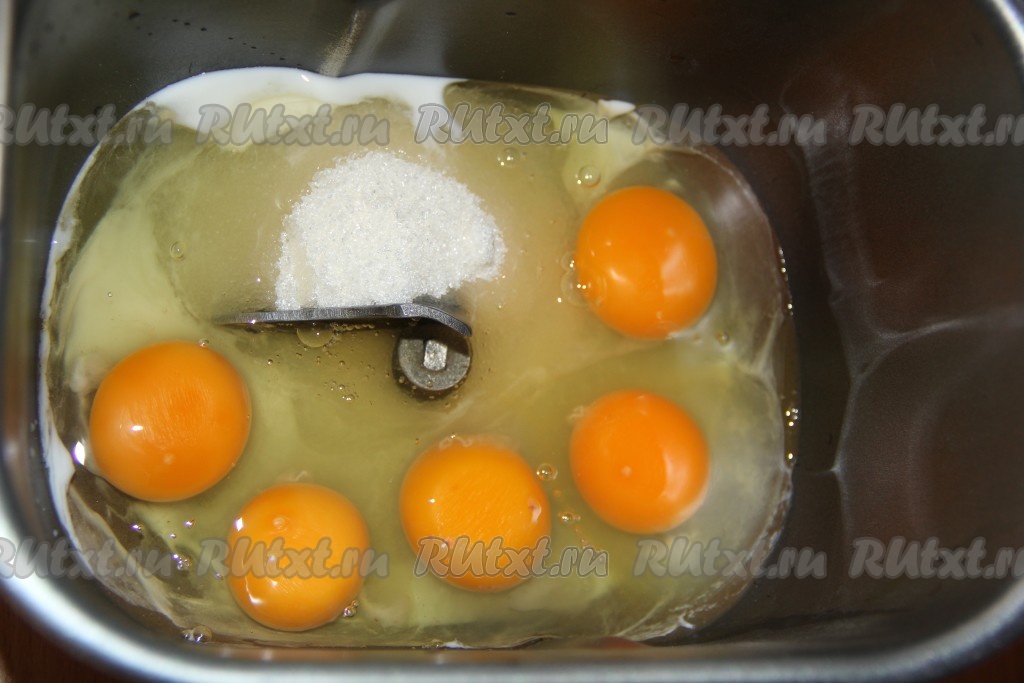 Сливочное масло для приготовления кулича "Бриошь" должно быть размягченным, поэтому заранее достаньте его из холодильника и оставьте при комнатной температуре. Если вы, как и я, будете делать замес теста в хлебопечке, тогда в ведёрко нужно всыпать сахар, добавить яйца и молоко.