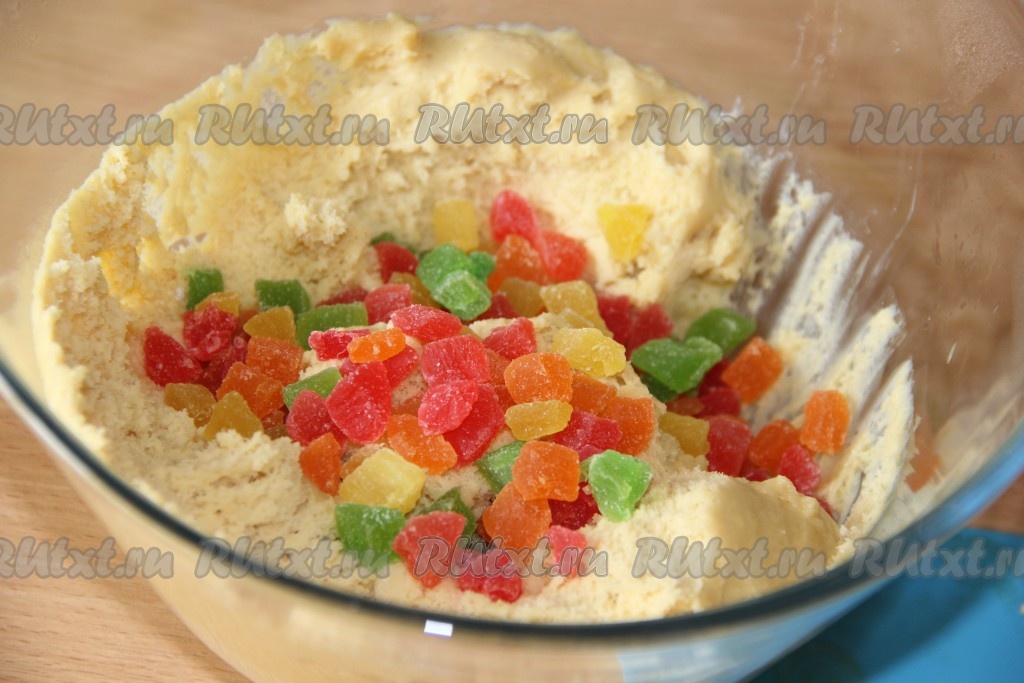 Достать тесто из холодильника, добавить в него цукаты и подмесить их в тесто.
