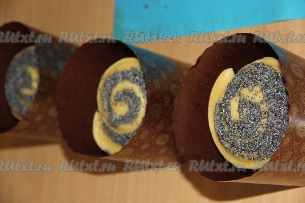 Выпекать ажурные маковые куличи в разогретой духовке минут 45 при температуре 200 градусов (готовность проверить сухой шпажкой).