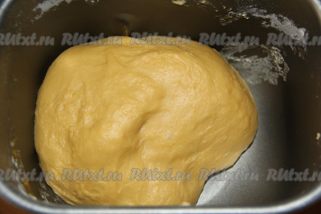 Установить режим "Замес теста" (в моей хлебопечке этот режим длится 1,5 часа). Если замешивать тесто вручную, тогда нужно соединить опару, сахар, желтки, соль, размягченное сливочное масло и муку, вымешивать тесто в течение 20 минут. Затем тесто оставить в тёплом месте на 1,5 часа, за это время оно увеличится в объёме в несколько раз. Тесто получится очень пластичным, нежным, не липнущим.