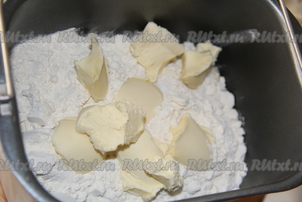 Затем всыпать муку, а сверху выложить кусочки размягченного сливочного масла, закрыть крышку хлебопечки. Для того чтобы масло было размягченным, его нужно заранее вынуть из холодильника.